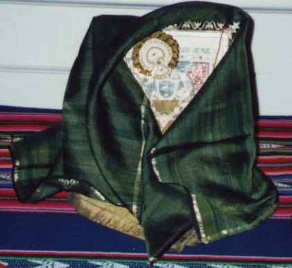 Shri Nathji enveloped in a dark green silk shawl. (house shrine) 41kb
