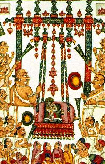 In the afternoon, the main audience chamber, Dolti-bari, is also covered in wall hangings. Colourful applique work on pastel background describes the various lilas of the Pritam-Var. Under the Dhruv-Bari, facing Girdhar-Gopal, hangs a beautiful applique work depicting the joys of Janmasthami to come, as Nanda-Baba and Jashoda-ma adore their lovely child in a beautiful palana. A gilded hindola, with inlay of semi-precious stones and paste, is erected in middle of the Dolti-Bari. Madan-Mohanji officiates for Shri-Nathji, as He swings in this sumptuous setting. Kirtaniyas of Kanaiya-Lal are accompanied by numerous priests, as everyone praises the beauty of the Lord and His Beloved.