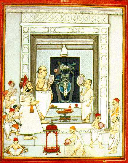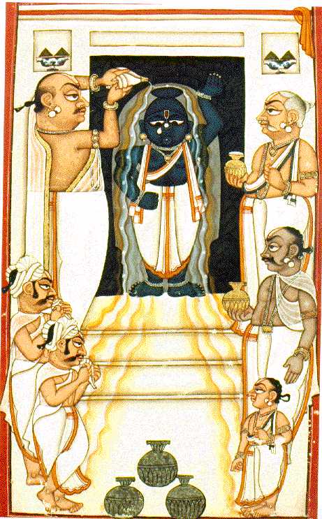 and Bhog darshan in the late afternoon, a tall, strong servant, dressed in white, pours