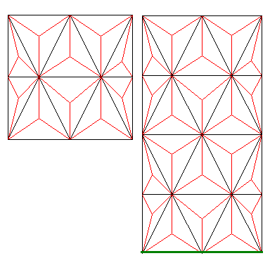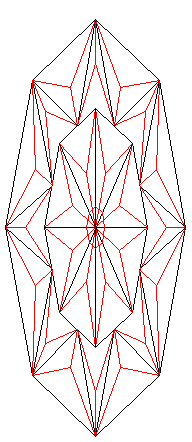 I was playing in my CAD and came up with some other designs for a three dimentional quilt using this sub-divide method. Here is starburst I drew. With the right shading, this could be stunning! Black lines are the triangles, red lines are the sub-divides. But look at what I can do to it! I drafted this in my CAD at 7 inches square. Now if I want it to make it in cloth 24 inches square, all I have to do is "scale" it up to 24 and print it out. I may want to sub-divide it further, divide all the smaller triangles again. Then with the other sub-divides, I could print it out for a queen size bed, I can do that too in about 2 seconds! It might take a whole roll of freezer paper but I bet it will lay perfectly flat.