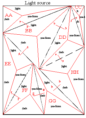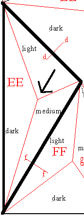 Okay, now we have to divide our triangles into the light, medium, and dark area's. You can: If you chose to trace each triangle as at the left, you will now trace one triangle and cut out it out. You will find a spot to start your dividing (we will get to that!) If you chose to just make another full drawing, you can sub-divide each triangle as it is on the whole paper. Then cut it apart later as you go. (That is what I did!) ta...da...da...da...ta...ta...ta...taa...daaa (sing jeopardy music here!) I am waiting! ... do what you are going to do then go on...
