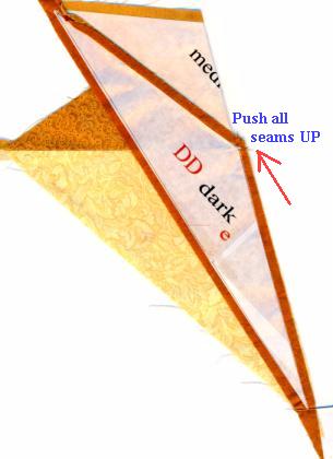 sections. The real beauty of setting in seams and not sewing in the seam allowances, is that you can "twirl" your seams and you don't ever get a big lump there. Keep all seams loose and you twirl whichever way you want to. Now do all your triangles. |