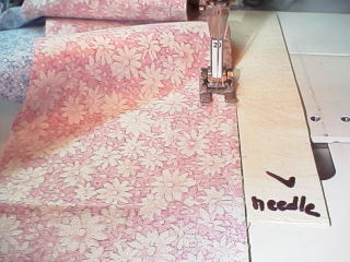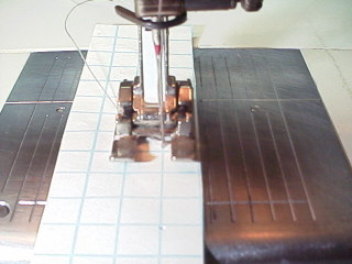 First things first. Getting an accurate 1/4" seam allowance. You must have an accurate seam allowance! How to test? Cut three strips of fabric 2" wide. Sew the three strips with what you think is your 1/4" mark on your sewing machine. Press the seams of the strips in one direction. Now measure them. They should measure 5" across with the center piece measuring 1 1/2". If the set is smaller or larger, move your 1/4" mark and try again until it is right! Remember that pressing in one direction also takes up some fabric. I put masking tape on my machine to guide me. Just follow the