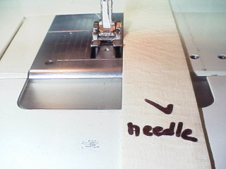 I put "check needle" on the tape. Why? If I put my needle in the center position on my Bernina, the feed dogs stick out beyond the pressure foot and I can't put tape on there because the tape will cover the feed dogs. So, if I move my needle over on click to the right, I am clear of the feed dogs with my tape. |