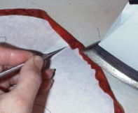 ![]() At the top of the pumpkin where there is a *inward dip* in the design, you have to make some clips in the fabric about 1/4" apart and almost to the paper. This will allow the fabric to fan out when you press it over the paper. Otherwise, it would just bunch up. (This goes for any appliqué pattern you are making.) |