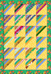 To make this quilt use many different medium color fabric strips and one fabric for the plain side. It is set in a straight set. The nice thing about the straight set it that you only have the seams between the blocks to match. |