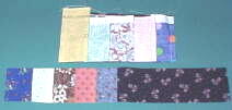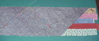 It is really easy to figure out: If you cut your strips from selvage to selvage and cut your squares using the diagonal measurement for the 6 3/4" strip sets (which *should* be 9 1/2") you will be able to get four squares across your strip. Cut each of them in half, and you have 8 triangles for your strip set blocks. |