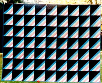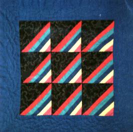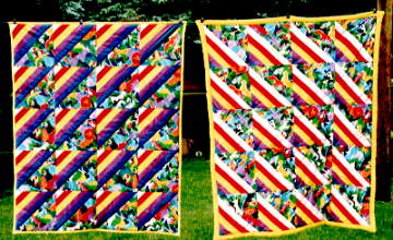 One quilt is made from the top down cut and one quilt is made from the bottom up cut. Remember that you get two different blocks? This is a wild kids jungle print in the large triangle and the same strips used throughout. Notice how the one with the darker being the longest looks darker and the one on the right with the light strip the longest looks much lighter although they are the same fabrics throughout. My granddaughter got one and a friends child got the other. (sorry about the bad picture but this is an older quilt set before digital) |