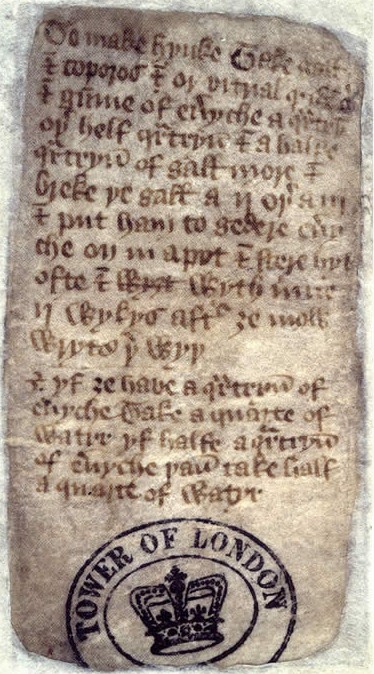 | Right, so it's not Anglo Saxon, but rather Middle English - but to the left is a small recipie for ink, ca 1483, which I thought readers might find interesting. It translates as thus: "To make ink. Take (oil) and copperas and or vitriol (quarter) and gum of (clyche) a quarter or half quarter and a half quarter of gall more and break the gall a 2 or a 3 and put them together every the one in a pot and stir it often and within 2 weeks after you (mol) write the (wyr) and if you have a quarter of clvyche take a quarter of water if half a quarter of cliyche then take half a quarter of water." |