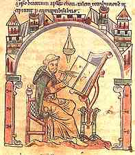 | To write using the Caroline minuscule script, which employed many small curves like English alphabet today, was almost impossible when using wood and stone and metal. Ink was called Encaustum in the Latin, and was made from oak galls crushed in rainwater, and thickened with gum arabic. Iron salts and natural pigments gave the desired color. What did they use to write on? Paper, made from wood pulp, was not stable at that time, and crumbled into dust very quickly. Scribes used the hide of a sheep, scraped thin and smooth, to write upon. This was called vellum, and all the surviving documents of the time were written upon it; from religious works and songs, to dry legal documents and popular tales like the Beowulf saga. |