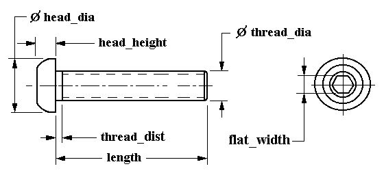 ISO Socket Button Head (ISO 7380 ) Size Thread Dia Thread Dist Head Dia Head Height Flat Width Length M3X0.5 3.0000 1.00000 5.7000 1.65000 2.0450 6, 8, 10, 12 M4X0.7 4.0000 1.40000 7.6000 2.20000 2.5600 8, 10, 12, 16 M5X0.8 5.0000 1.60000 9.5000 2.75000 3.0800 10, 12, 16, 20, 25, 30 M6X1 6.0000 2.00000 10.5000 3.30000 4.0950 10, 12, 16, 20, 25, 30 M8X1.25 8.0000 2.50000 14.0000 4.40000 5.0950 10, 12, 16, 20 to 40 by 5 M10X1.5 10.0000 3.00000 17.5000 5.50000 6.0950 16, 20 to 40 by 5 M12X1.75 12.0000 3.50000 21.0000 6.60000 8.1150 16, 20 to 50 by 5 M16X2 16.0000 4.00000 28.0000 8.80000 10.1150 5 to 50 by 5