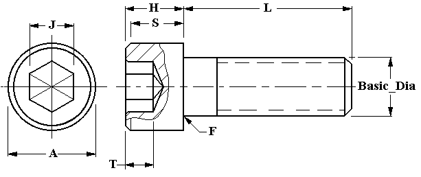| BASIC DIA | A Head Dia. | H Head Height | S Side Height | J Hex Size | T Key Engage | F Fillet Radius |