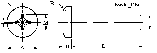 Phillips Pan Head BASICDIA. AHead Dia. HHead Height RHead Radius MRecess Dia. NRecess Width NO.0 0.116 0.039 0.020 0.067 0.013 NO.1 0.142 0.046 0.025 0.074 0.014 NO.2 0.167 0.053 0.035 0.104 0.017 NO.3 0.193 0.060 0.037 0.112 0.019 NO.4 0.219 0.068 0.042 0.122 0.019 NO.5 0.245 0.075 0.044 0.158 0.028 NO.6 0.270 0.082 0.046 0.166 0.028 NO.8 0.322 0.096 0.052 0.182 0.030 NO.10 0.373 0.110 0.061 0.199 0.031 NO.12 0.425 0.125 0.078 0.259 0.034 .25 0.492 0.144 0.087 0.281 0.036 .3125 0.615 0.178 0.099 0.350 0.059 0.375 0.740 0.212 0.143 0.389 0.065 .4375 0.863 0.247 0.153 0.413 0.068 .5 0.987 0.281 0.175 0.435 0.071 .5625 1.041 0.315 0.197 0.470 0.076 .625 1.172 0.350 0.219 0.587 0.081 .75 1.435 0.419 0.263 0.633 0.086