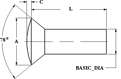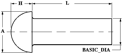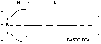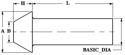 AMERICAN STANDARD SMALL SOLID RIVETSANSI/ASME Standard #ASME B18.1.1-1972 (R1995) Button Head Rivet BASIC DIAMETER AHead Diameter HHead Height .5 0.8750 0.3750 .625 1.0940 0.4690 .75 1.3120 0.5620 .875 1.5310 0.6560 1 1.7500 0.7500 1.125 1.9690 0.8440 1.25 2.1880 0.9380 1.375 2.4060 1.0310 1.5 2.6250 1.1250 1.625 2.8440 1.2190 1.75 3.0620 1.3120 High Button Head (Acorn) Rivet BASICDiameter AHead Diameter HHead Height .5 0.7810 0.5000 .625 0.9690 0.5940 .75 1.1560 0.6880 .875 1.3440 0.7810 1 1.5310 0.8750 1.125 1.7190 1.9690 1.25 1.9060 1.0620 1.375 2.0940 1.1560 1.5 2.2810 1.2500 1.625 2.4690 1.3440 1.75 2.6560 1.4380 Cone Head Rivet BASICDIAMETER AMajor Head Diameter BMinor Head Diameter HHead Height .5 0.8750 0.4690 0.4380 .625 1.0940 0.5860 0.5470 .75 1.3120 0.7030 0.6560 .875 1.5310 0.8200 0.7660 1 1.7500 0.9380 0.8750 1.125 1.9690 1.0550 0.9840 1.25 2.1880 1.1720 1.0940 1.375 2.4060 1.2900 1.2030 1.5 2.6250 1.4060 1.3120 1.625 2.8440 1.5240 1.4220 1.75 3.0620 1.6410 1.5310 Pan Head Rivet BASICDIAMETER AMajor Head Diameter BMinor Head Diameter HHead Height .5 0.8000 0.5000 0.3500 .625 1.0000 0.6250 0.4380 .75 1.2000 0.7500 0.5250 .875 1.4000 0.8750 0.6120 1 1.6000 1.0000 0.7000 1.125 1.8000 1.1250 0.7880 1.25 2.0000 1.2500 0.8750 1.375 2.2000 1.3750 0.9620 1.5 2.4000 1.5000 1.0500 1.625 2.6000 1.6250 1.1380 1.75 2.8000 1.7500 1.2250 Flat Countersunk Head Rivet BASICDIAMETER AHead Diameter .5 0.9360 .625 1.1940 .75 1.4210 .875 1.6470 1 1.8730 1.125 2.1140 1.25 2.3400 1.375 2.5670 1.5 2.7930 1.625 3.0190 1.75 3.2620 Oval Countersunk Head Rivet BASICDIAMETER AHead Diameter CCrown Height .5 0.9360 0.0950 .625 1.1940 0.1190 .75 1.4210 0.1420 .875 1.6470 0.1660 1 1.8730 0.1900 1.125 2.1140 0.2140 1.25 2.3400 0.2380 1.375 2.5670 0.2610 1.5 2.7930 0.2850 1.625 3.0190 0.3090 1.75 3.2620 0.3320