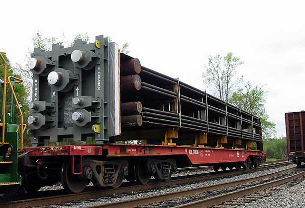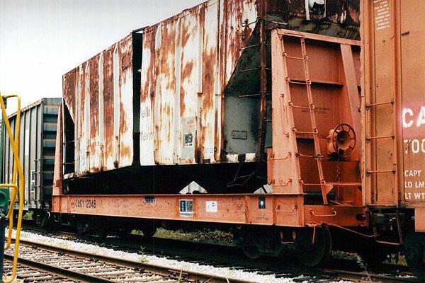 CAGY 12048 loaded with the ends of a hopper after the middle compartment was cut out to store the sand for the sanding tower at the Columbus locomotive servicing facility
