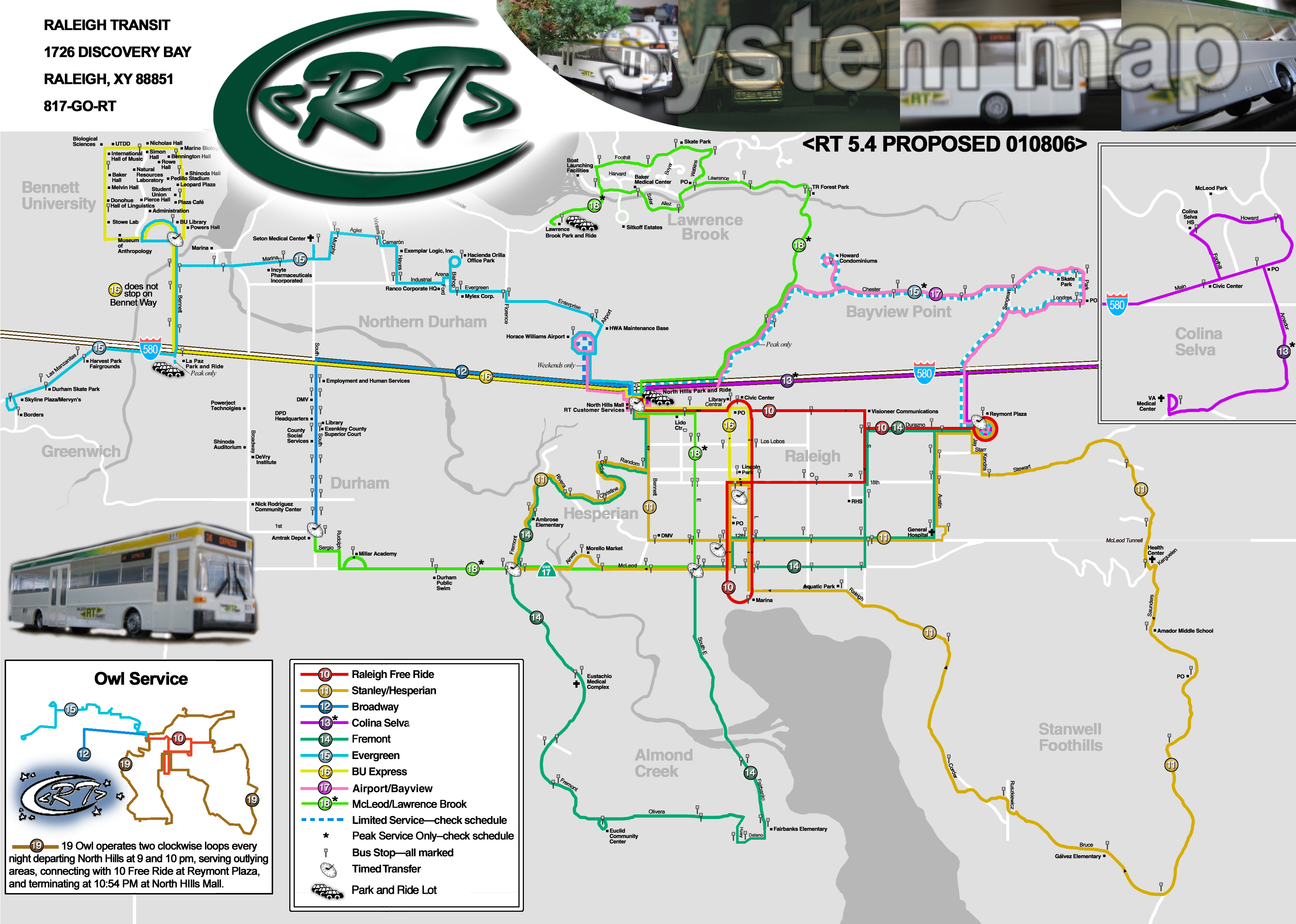 | System Map Service Overview 10 Raleigh Free Ride North Hills, Civic Center, Reymont Plaza, Lincoln Park, Marina 11 Stanwell North Hills, General Hospital, Reymont Plaza, Stanwell Foothills, Lincoln Park, Hesperian 12 Broadway-Weekdays North Hills Mall, Durham Civic Center, Durham Financial District, Amtrak 12 Broadway-Weekends North Hills Mall, HW Airport, Durham Civic Center, Durham Financial District, Amtrak 13 Colina Selva North Hills, Reymont Plaza, Colina Selva 14 Fremont North Hills, Hesperian, Almond Creek, General Hospital, Reymont Plaza 15 Evergreen (to Skyline Plaza) Reymont Plaza and Bayview Point (limited service), North Hills, HW Airport, Hacienda Orilla, Seton Medical Center, Durham Marina, Bennett University, Skyline Plaza 15 Evergreen (to North Hills Mall/Reymont Plaza) (See above) 16 BU Express Lincoln Park, North Hills Mall, Bennett University 17 Airport/Bayview HW Airport, North Hills Mall, Bayview Point, Reymont Plaza 18 McLeod/Lawrence Brook Lawrence Brook, North Hills Mall, E Street, McLeod Road, Amtrak (runs peak hours only) 19 Owl North Hills Mall, Bayview Point, Reymont Plaza, Stanwell Foothills, Lincoln Park, Almond Creek, Hesperian (runs nights only) | ![]() |