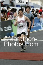 This marathon did not start well. After covering just 50 m, I tripped. The record crowd was huge. There wasn�t much room at all to maneuver. So I tried running at the side of the road. But it had a little contour where the tarmac ended. When my foot stepped on the contour, I lost my balance and tripped. Fortunately I managed to regain my balance and so I did not fall completely. But my left ankle had been hurt. I continued running, hoping that the pain would subside soon. (This brought my mind back to one of my marathons in Honolulu many years ago, where a similar thing happened. In that marathon, my right ankle hurt slightly for a few miles, but I managed to finish the race.) Fortunately, this time the pain subsided after just a few minutes. So I carried on running, feeling relieved, watching my steps more carefully from then on.