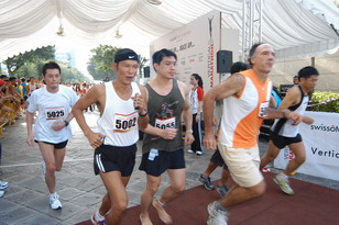 I slowed down drastically and struggled on. Every step was torture. At the 68th storey, with just 5 storeys more to go, I heard furious footsteps right behind me. Another runner was threatening to overtake. Though exhausted, I was not in the mood for being overtaken. So I sprinted up till I reached the finish line, gasping for breath, with the chasing runner still hot on my trail. Hence, I achieved my impromptu goal of not being overtaken again.