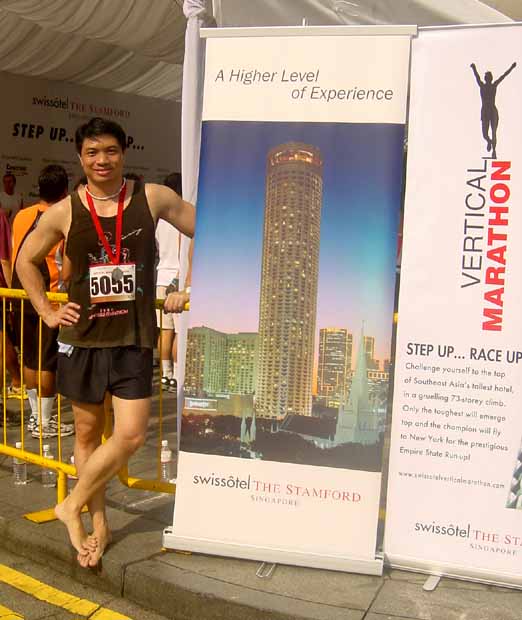 I had also decided to stair climb barefoot. Most of my stair climbing training had been done barefoot. (I just hopped out of my apartment and begin climbing the 22-storey apartment building. Couldn't be bothered with shoes). And so I was very used to climbing barefoot. I emailed the great barefoot runner Rick, creator of www.barefootrunner.org, asking for advise. (He was the inspiration for my first barefoot race - New Balance 10 km run.) He encouraged me to stair climb barefoot too, just be careful not to snub my toes.