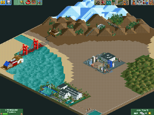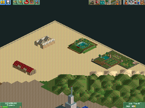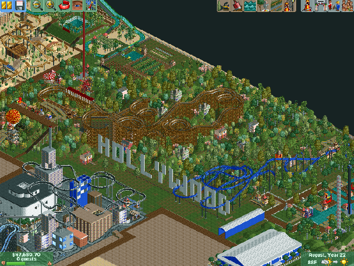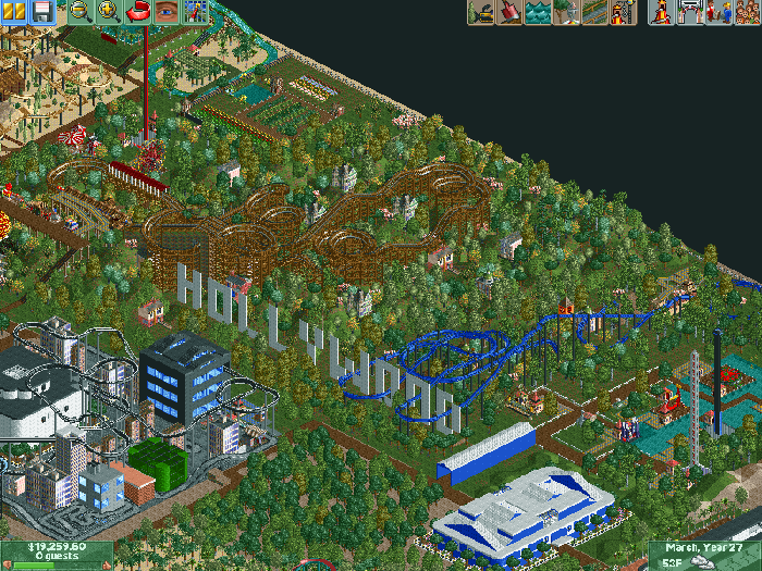 This is a picture of the completed Hollywood Hills section of my park. I am very proud of it. I had been thinking of a way to incorporate the 'Hollywood' sign since the day I started this park. All of a sudden, it hit me! And even better, I was able to form a ride from the scenery!