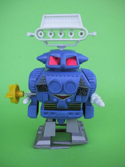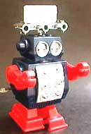Nombre: Robot Clim n� 32. Tipo: De pl�stico a cuerda. Mide 14 cm. Fecha: �? Fabricante: Clim. Localidad: Ibi, Alicante. Acciones: Movimiento lineal y giro circular de la antena.Tiene unos misiles que se disparan desde el brazo mediante resorte. Detalles: No parece original, recuerda al Radar Robot. No tiene nombre espec�fico y s�lo un n�mero sirve para distinguirlos. Desconozco el n�mero real de esta serie de robots. |