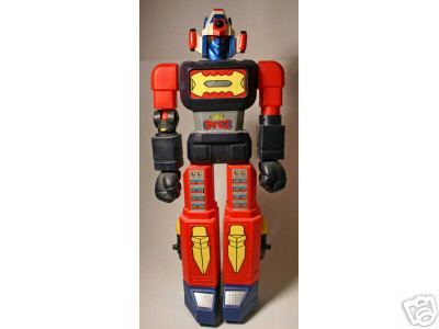 Nombre: Robot. Tipo: De pl�stico con resortes. Mide 58,5 cm. Fecha: �? Fabricante: Nacoral. Localidad: Zaragoza. Acciones: No tiene movimiento. Lanza los pu�os y unos misiles desde las piernas. Detalles: No es un robot original. Impresiona su tama�o. Es una copia del robot Daimos de la serie Shogun Warrior de la empresa japonesa Mattel. Tiene un gran parecido con Mazinguer Z, que se estren� en la televisi�n de finales de los 70, y que tambi�n tiene un modelo de Mattel y su copia de Nacoral. |