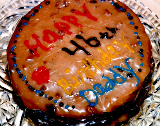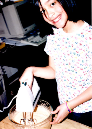 Chey mixes up my '98 birthday cake. It was banana flavor, with caramel pecan frosting.