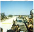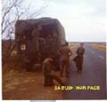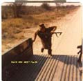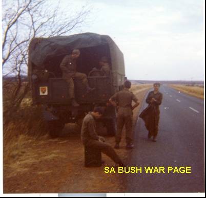 | On the way back to Potchefstroom from Bray. Our Bedford ran out of fuel due to a faulty fuel gauge, a common Bedford problem. Waiting for the fuel bowser in the convoy to reach us. Many guys pinched ammo, flares, etc. while we were in the Kalahari, but we heard that there is going to be a "uitpak inspeksie" kit-inspection upon arrival in Potchefstroom, so many discarded the ammo, flares, etc. along the road on the way back to Potchefstroom. |