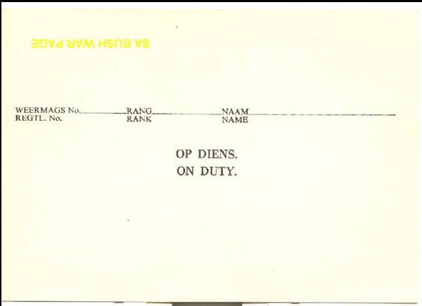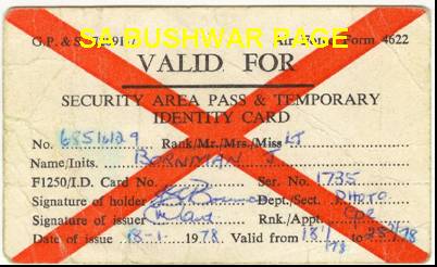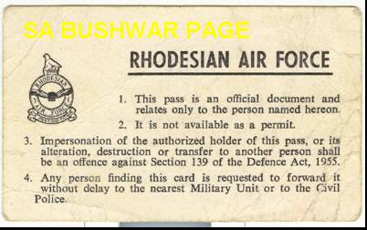 | Back of Rhodesian Airforce security card used by MI member visiting Rhodesia. By 1979 it was clear that the end of the Rhodesian white regime is near, and MI took the opportunity to visit Rhodesia for Intelligence gathering, before the change of Government. By example, Charl Malan, on of the MI officers working with us, took many panoramic shots from high buildings in Salisbury (Harare), for this purpose. |