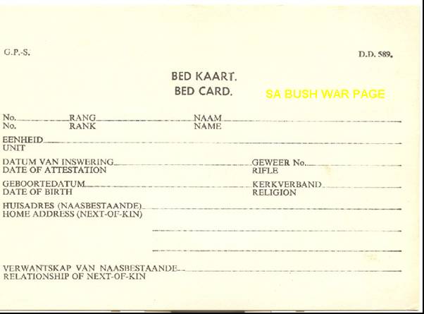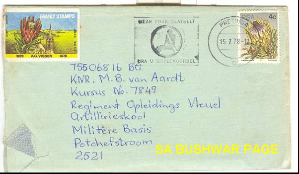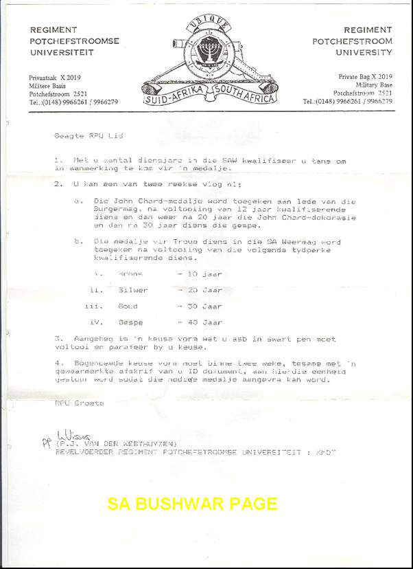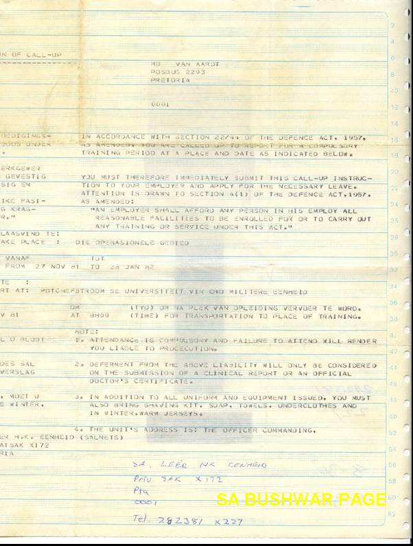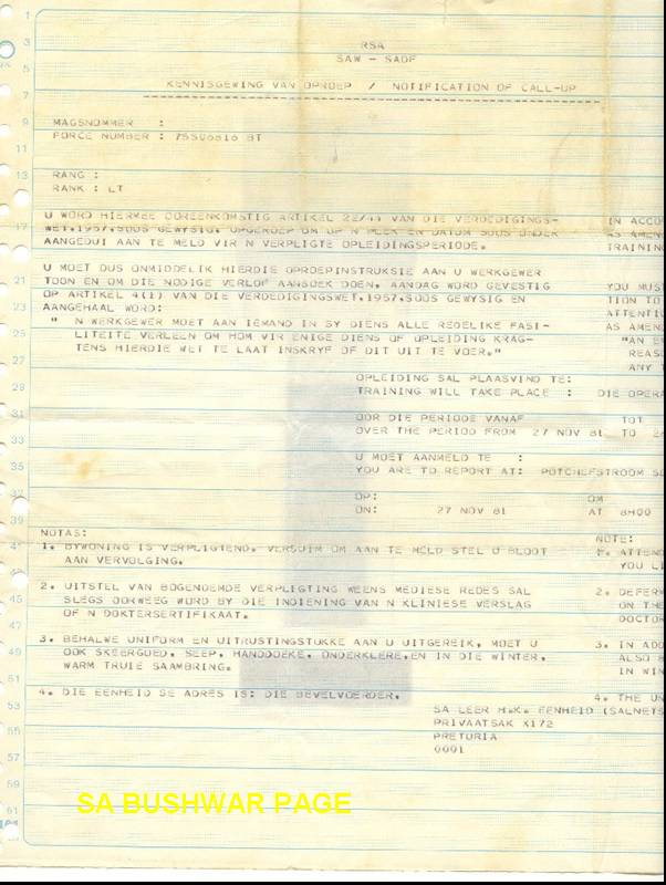 | National Service chronology. - Revieved Force number (75508016 BG) in 1975 while in st. 8 at Afrikaanse Hoer Seunskool, Pretoria; 16 years old. - Received call-up papers in matric (1977), to 4th Field Regiment, Potchefstroom. - Reported for National Service as: Gnr. M B van Aardt. Force no: 75506816 BG - "Roof" train from Pta station to Potchefstroom in January 1978. - Assigned to 1 Meduim Battery, 4th Field Regiment for 3 months basic training. - Elected for Officers training at School of Artillery outside Potchefstroom. - Completed Junion Leader;s course (course no. Art 7849), qualifying as 2nd lieutenant - As part of JL's course, did Platoon and Section leading course, and Counter Insurgency course on Botswana border in the Bray/Pomfret/Terre Firma area. - Saw the first prototypes of the G5 and G6 being evaluated, as well as the Valkiri prototypes. Also saw G3's- 8wheel 155mm WWII vintage, and G4's - Soltam 155mm) - Elected to go to Militayry Intelligence for 2nd year of national service. Joined MI in Jan. 1979. Security clearance - Top Secret. - Assigned to Jaric (Joint Air Reconnaissance and Intelligence centre at AFB Zwartkops. Compiled target dosiers for several operations in Angola, Mozambique, Botswana, Zambia. - Did further MI work at Poynton building, Pretoria, 21 and 22 floors. - Attended a course on Eastern Bloc ship recognition at Silvermine, Capetown. - Attended a navigation course at Silvermine, lectured by old Capt Gower, who also taught the Long Range Desert Groups (LRDG) of WWII. - Assisted with annual MI conference between SA and Isreal, held at the just completed MI school, Fort Klapperkop, Pretoria. |