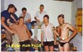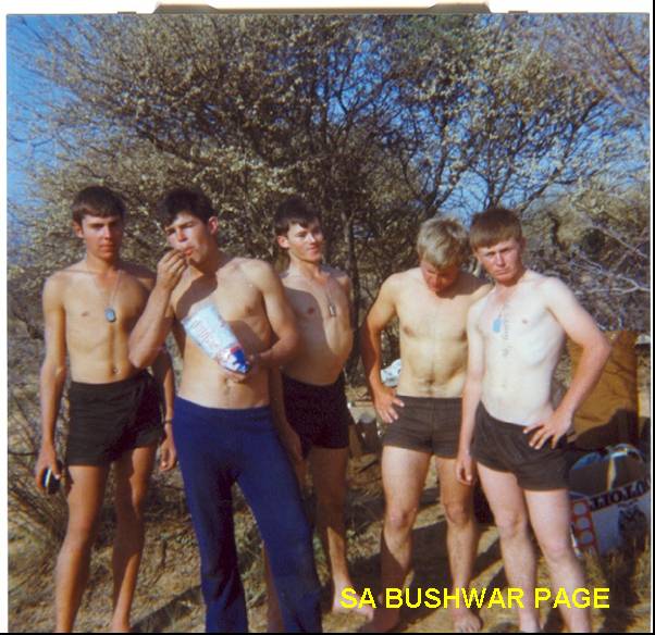 | Myself, Peet Prinsloo, Hans Sittig (German), ??, and Kosie Smit, posing in black PT shorts. Note dogtags. Flowering "Swarthaak" tree in the background, with vicious hooked thorns, one which hooked into my eyelid one dark night. It took some carefull manipulation to remove it. |