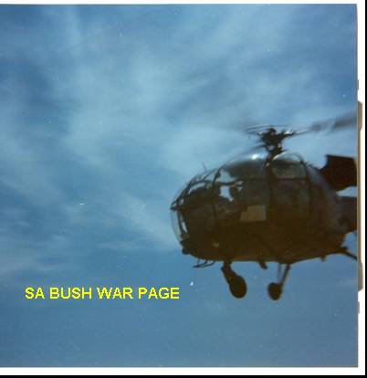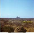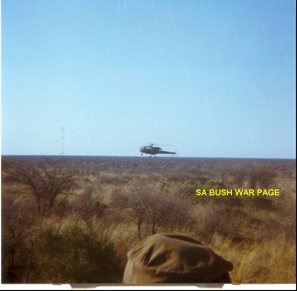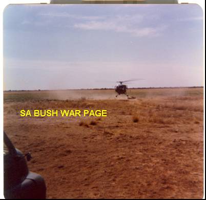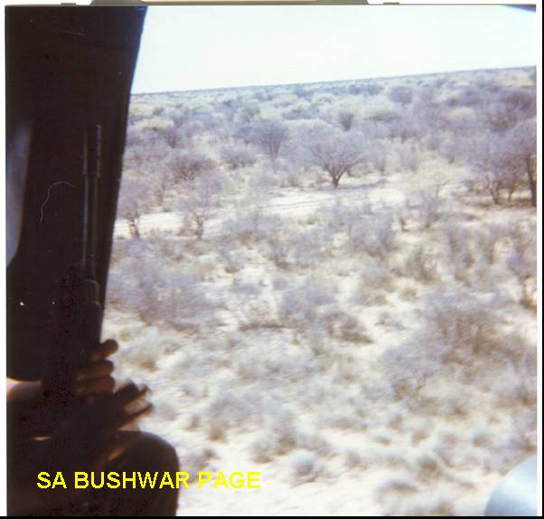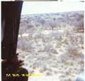 | Allouette III chopper hovering low with Sgt Mgr van Coller, directing a sweep maneuver to look for an local womand body reported by the local poplulation. It was our firts call for real action and everybody was very excited. Sgt Major Van Coller had such a load voice that he directed the operation without a loudhailer from the chopper, and we could hear him above the chopper noise. No body was found. Note the featureless flat Kalahari landscape that made navigation very difficult. It was the days before GPS, and magnetic compassed did not work, due to geological disturbances. We got lost on several occations. |
