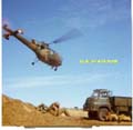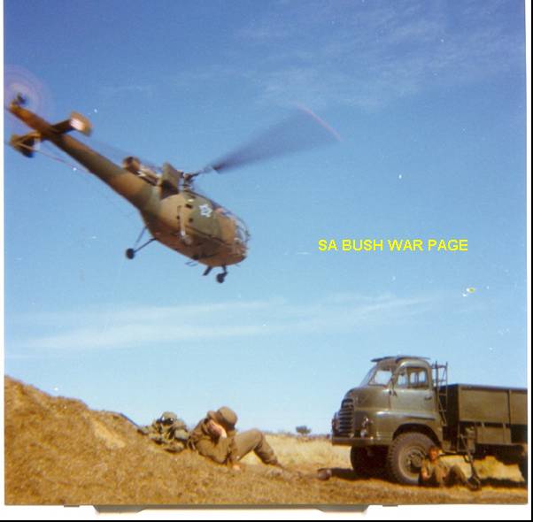 | Chopper drills with an Allouette III in a peanut field on the Botswana border. The heap of peanut harvest waste on the left still contained many nuts, and was a favourate place to augment the less than sufficient army rations. Note the Bedford truck still in the old green colour, and canvass removed for Coin-Ops training. Note sand filter on the engine inatke. |