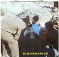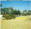 | "Teiken waardering" or "gevegswaardeering" Target-appreciation during Coin-Ops training. We stopped near a small "kraal" of the local population, and then had to work out a plan for a platoon attack on the site. A sand-model was built back at the base, after site observations and skecthes were made. Note the old green colour Bedford, and the newer SADF brown Bedford truck. These were called "bulldog" Bedfords due to the round shaped cabin, as opposed to the square cabin of the newer Bedford versions. Note School of Artillery badge on front vehicle, and Bren gun behind Chris Rossouw (standing) Chris was a friend who later went with me to Military Intelligence. (Son of Leon Russouw, famous SA writer.) Nickname was "bicycle eyes", as he wore his grandfathers small round glasses. |