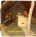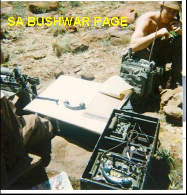 | Manning an OP Post with listening devices to plot the origin of "enemy" gun and mortar fire. A citizen Force unit almost used our "koppie" hill for a target but were stopped just in time. Fouche with the A44 radio handset catching a tan. Note plotting map, larger B56 radio on the left, and listening device equipment on the foreground. |