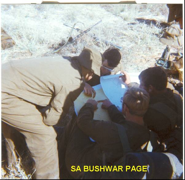 | After a 2-day patrol along the dry Molopo river forming the border with Botswana, we were looking forward to the chopper airlift back to camp. On hearing the choppers, we fired a 1000ft flare, and the chopper landed in the gravel road. Instead of picking us up, the co-pilot kicked out a box of canned food, and a 1:50 000 map of the area, and said we had to walk back the 80kms to base. According to him, the chopper fuel at the base is contaminated and there is not enough fuel to fly us back. We had a very strong suspicion that the real reason was that the crews wanted to go back to Pretoria, as it was some long-weekend in October! On take-off, the turbulance sucked their navigational maps out of the door and tore it to shreds - we were very pleased by that. On the photo, Martin Rhoode left (neighbours to my parents, bombadier Delport light hair (our section), and Sergeant Claasen right (Ops Savannah veteran) consult the map to locate our position during the 80km march. Note headset of the heavy C27 radio in the background. Made turns to carry it, and it could receive Radio 702! We got lost several times in the featureless landscape with thick bush, and magnetic compases not working due to the geology. We slept outside empty farmhouses, vacated due to a severe drought and security threats. Drank brackish and dirty cattle trough water, once bought chickens from local population. Due to water scarcity we also drank all liquids from canned food. On arriving back at base 3 days later, most guys strormed the bowser truck and drank as much fresh water as possible; this was not enough, and I bought 4 cans of colddrink at the canteen, and finished then off immedtaely as well! |