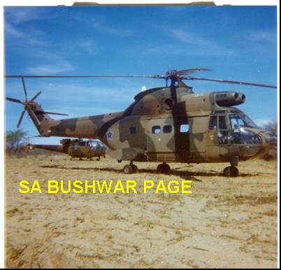 | Puma helicopter taking off at sunset after a day of chopper drills and a display of firepower given to local Kalahari farming community. We had a lot of opened but unused ammo, which had to be disposed of. A platoon mock attack was done after darrk, with 2 platoons (60 people) firing a 20-round magazine of red tracer rounds, whle the insrtucters were tossing white phospherous grenades, trip flares, 1000 ft flares, etc. a Hugh fireworks display! Some guys fired on automatic and did not keep it low, so there where streaks of red tracer fire through the Kalahari nightsky. Nearby Botswana must have wondered what the South-Africans are up to. |
