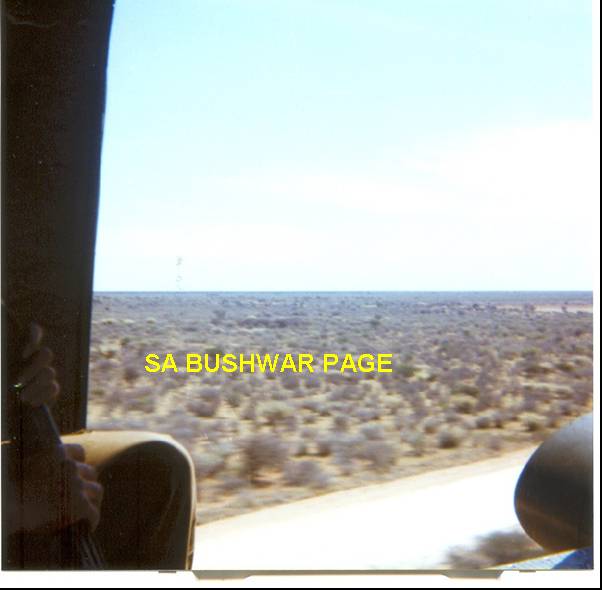 | View from an open Puma helicopter door, during chopper drills. Note the featureless Kalahari landscape. Some troops sat on the floor between the 2 open doors each side, and got quite a fright when the chopper suddenly banked sharply in a turn. Luckily the G-forces kept them firmly on the chopperfloor. |