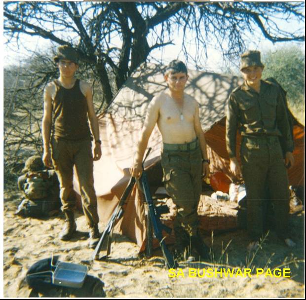 | Myself, Edzardt Russouw, and Van Eeden in from our me and Van Eeden's bivvie, soon arfter arrival in the area. Note R1 rifles, and my fullkit in the background. |