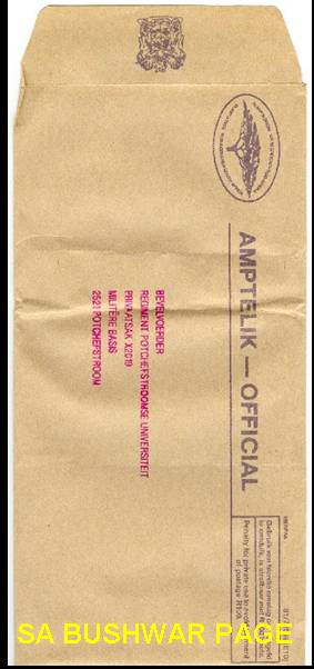 | Envelope containing call-up papers for 2-month Camp with Regiment Potchefstroom University (artillery unit). |