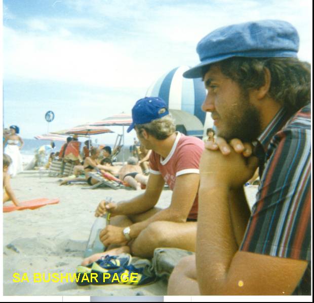 | Civvystreet at last! Drove my 250cc Yamaha scrambler all the way from Pretoria to Durban, and met up with Theo Thiart (army buddy), and his friend Loots (in the foreground). Drinking Vodka and Shweppes on South Beach Durban. |