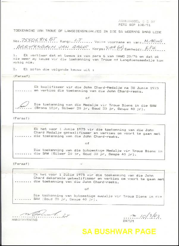 | Nomination for John Chard Long Service medal 12 years, or "Troue Diens" Long Service 10 years. Never received this medal. |