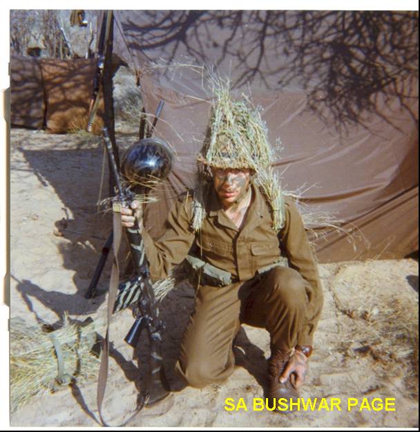 | Myself, just before departure on patrol training. Green camouflage cream (JAV) used on skin and rifle. JAV was also used to re-coluor faded kit such as webbelts, webbing. Note leathercap strap over wristwatch, similar to Isreali type of that period. Shiny "Staaldak" in the background camouflaged with "black is beautiful cream" (swart is kak room). Note effective camouflage of webbing with grass lying on the left. The loose Kalahari sand made for very difficult going. |