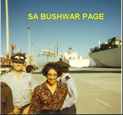 | During the course of Eastern Bloc ship recognition at Silvermine, a visit was also paid to the new container warf in Capetown harbour. Vina Hugo (lady) in the foreground, worked with us at MI where we did aerial photo interpetation of enemy installations in Angola, Zambia, and Mozambique. Compiled Target Dossiers from aeriel intelligence. |