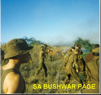 | Another Easter weekend past-time while on guard duty. The "oumanne" did gun-drills on the artillery range with 5.5 inch G2 guns, and some shells caused veld-fires. We fought fires for a whole day and right through the night. |
