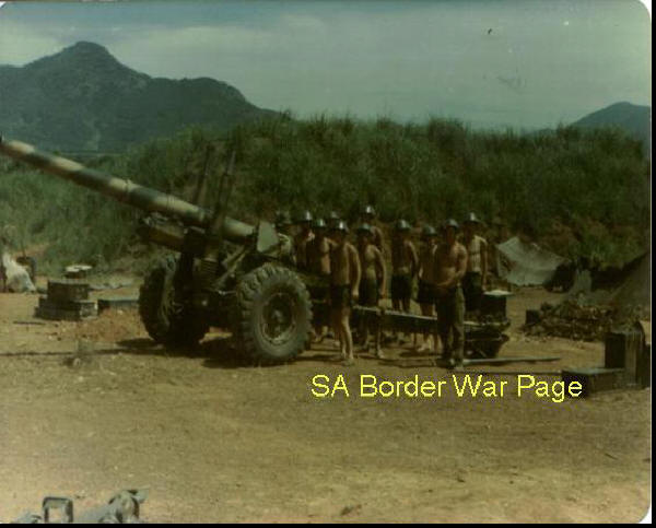 | A SADF 5.5 inch (140mm) gun and crew in Angola during Ops Savannah. Note the ast German helmets iisued by the SADF at Oshakati prior to the Operation, and the casual uniforms; typical of SADF units after being in the bush for extended periods. The camoulfage pattern of the gun is non SADF, and was part of the covert action to disguise the units as non-SADF. |