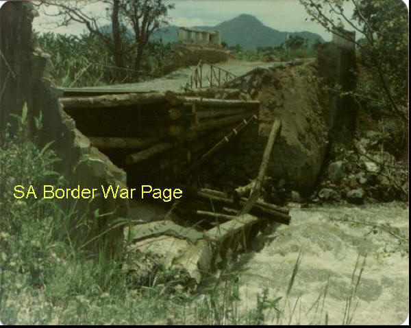 | The famous "Bridge 14" over the river Nhia in Angola where the battle of Bridge 14 took place during Ops Savannah on 9 December 1975. SADF Sappers repaired the bridge blown earlier by the enemy; with makeshift material as is evident in the photo, while under heavy Cuban/MPLA fire, including 122mm MRL rockets. The SADF lost 4 men in the battle, while enemy losses where etimated at 400. |