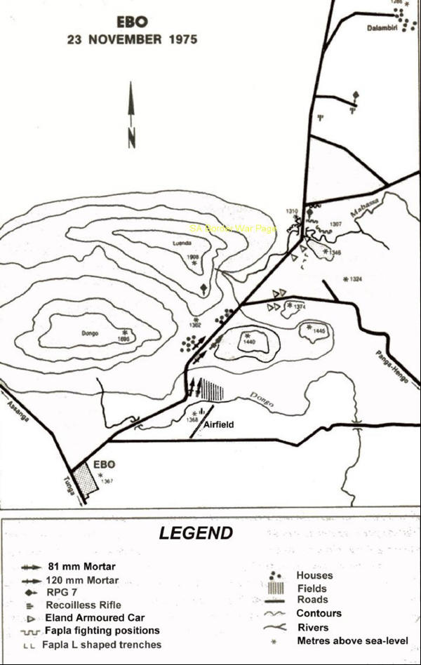| Map showing the location in Angola of the Ebo battles during Ops Savannah. |