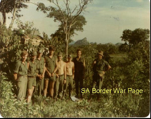 | What appears to be SADF "high brass" during Ops Savannah. Can anybody identify them? Col. Jan Breytenbach on the right? Note the varied non SADF uniforms as disguise. |