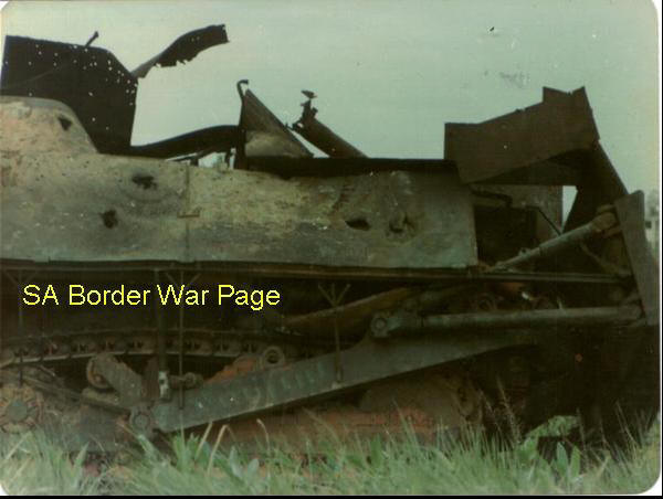 | An oddity of war! At the town of Luso the ANTISA forces deployed this armoured buldozer, which took several direct hits from the Eland 90's as is evident from the photo. The crew abandoned the vehicle during the battle while it was running and it came to a halt in a ditch. |